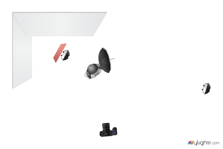 STROBIST: Two speedlites, one bare with red gel shooting in the background corner, one bare on 3 or 4 meters distance, shooting through the “gobo”. The gobo is a lace umbrella.