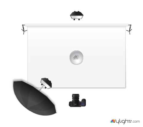 Food lighting setup. Note: the white backdrop is transluzent (made of translum foil), the speedlite is shooting through this foil. This gives the effect of a large softbox.