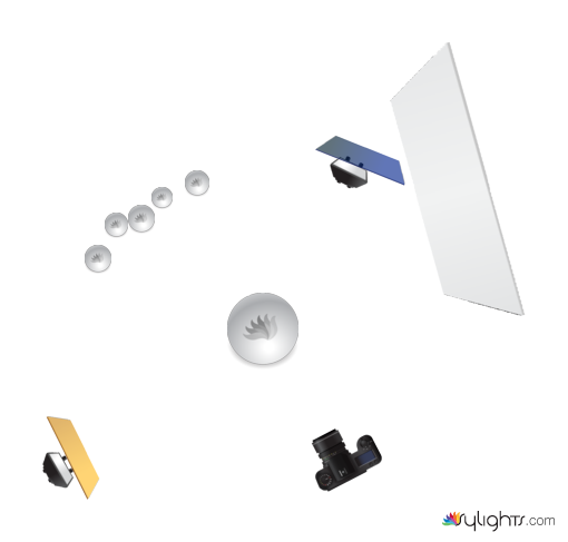 Two flashes, one with orange gel, one with blue,
