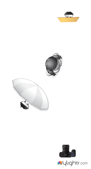 2nd: Front left, speedlite in white shoot-thru brolly, no gel