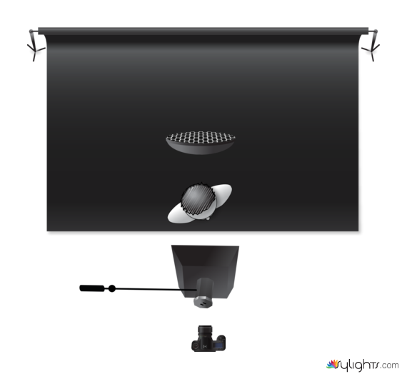 Here, two sources, one with a beauty dish + grid onto the background for a round and soft light on the dark grey, and a soft box on a boom arm, above our subject to get him into a light’s shower, to give that dramatic feeling on his face.