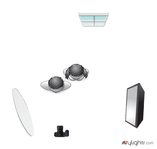 This is the lighting diagram for Lauren & Ryan. All images were created with a Canon EOS 1D Mark IV and a Canon 24 – 70mm f/2.8 L series lens, Canon 580EX II Speedlights and STE-2 wireless Speedlight transmitter in combination with Radiopopper transmitter and receivers. I used a Westcott 28" Apollo soft box for the light modifier and a Westcott silver/white collapsable reflector for fill.