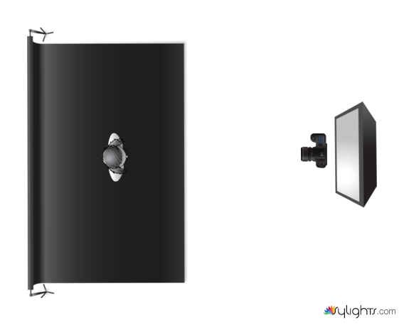La foto è realizzata posizionando il soggetto particolarmente vicino al fondale e scattando a non meno di un metro di distanza zoomando per evitare distorsione ottica. La softbox è collocata alla stessa distanza della fotografia rispetto al soggetto.