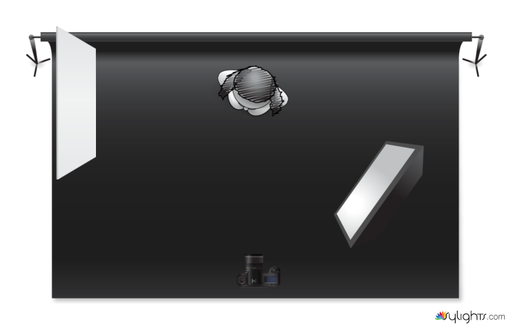 La fotografia è stata realizzata su fondale nero. Il soggetto è posizionato frontalmente rispetto alla fotocamera. Il corpo è leggermente ruotato per favorire l'esposizione del braccio, il viso è invece leggermente ruotato di 3/4 nel senso opposto. Il soggetto non guarda verso l'obbiettivo, ma verso la fonte di luce per rendere lo sguardo più luminoso. Lo schema di luce ottenuto è di tipo loop: in questo caso la softbox va posizionata quasi frontalmente rispetto al AL VISO in modo tale da creare una sorta di "ansa" in prossimità del naso (caratteristica principale di questo schema di luce, regolare quindi la fonte di luce in base a come il soggetto volta il viso). Per smorzare le ombre, soprattutto sul collo e all'estremità opposta rispetto alla porzione di viso illuminata, aiutarsi con un pannello bianco a distanza non troppo ravvicinata rispetto al soggetto (per non eliminare completamente le ombre).