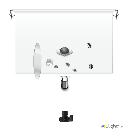 Un SB600 avec grid maison a droite et un reflecteur argenté en face a 1/2.