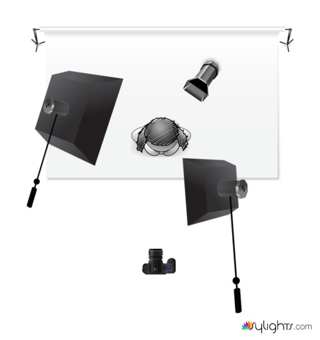 Detrás del sujeto, apuntando al cabello o hombros.