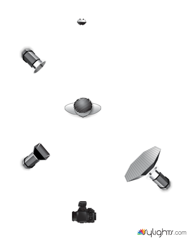 A key light at the subject’s 10 o’clock, a fill light at 2 o’clock, a backlight at 5 o’clock, and some practicals in the background at 6 o’clock.
