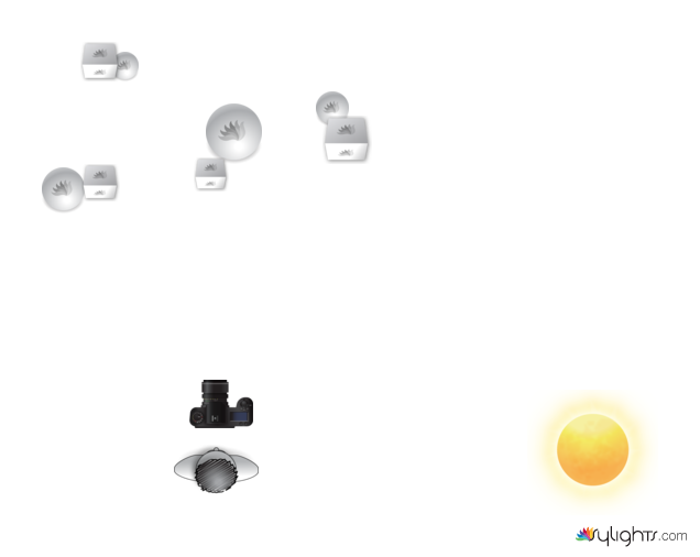 Simple schéma pour visualiser les prises de vue (les sphères et cubes représentent les objets disséminés dans l’environnement)