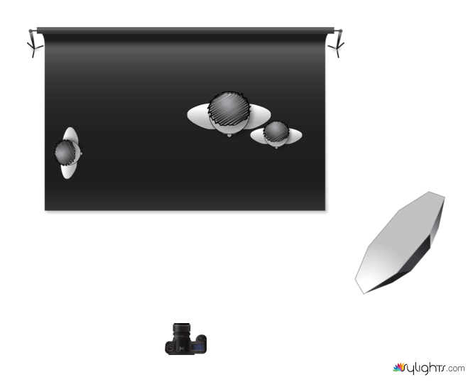 single dominant key light to preserve a sculptural, painterly atmosphere. A Profoto B2 fitted with a softbox and honeycomb grid was positioned approximately 45° to camera left and 35–45° above eye level. The grid was used to precisely control light spill, keeping the background in controlled darkness while isolating the subjects in a narrow beam of soft, directional light. No fill light was applied. Shadow density was shaped through negative fill created by dark walls, furniture, and floor surfaces. This approach produces deep, dimensional shadows, emphasizes facial structure, and creates a floating, suspended visual effect, allowing movement to occur within a quiet, cinematic atmosphere rather than a decorative studio environment.