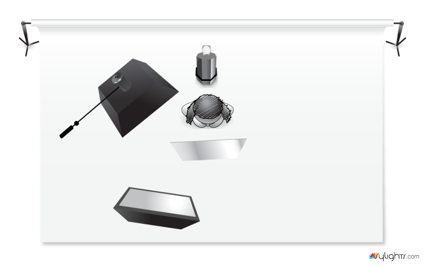 overhead light rectangle with grid, front fill light rectangle softbox no grid, bare bulb facing wall directly behind model