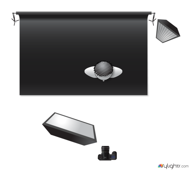 Der zweite Blitz schräg hinter der Person ist optional (Rimlight), um bei einem schwarzen Hintergrund dunkle Kleidung oder Haare besser erkennbar zu machen. Bei einem hellen Hintergrund ist dies nicht nötig.