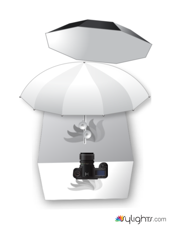 Camera is directly in front and angled downward onto the subjects. A white sheet is used as a tent around the subjects to diffuse the bright reflections and harsh shadows. An octagon soft box is placed behind and slightly to the right, and is about three feet above the subject angled downward.