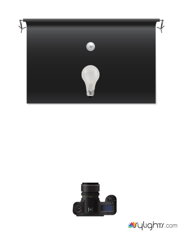 Le setup est assez simple, un fond noir, dans ce cas ci, un drap et l’ampoule est posée sur un plexi noir pour obtenir un reflet. La seul source de lumière, c’est un feu de bengale qui est placé entre l’ampoule et le fond noir. Celui-ci, est représenté par la petite sphère sur le schémas.