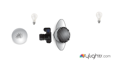 The lightbulb next to the plate is on a slightly higher level, while the light source at the back of the photographer is a ceiling light to diminish any sharp shadows from the back of the plate.