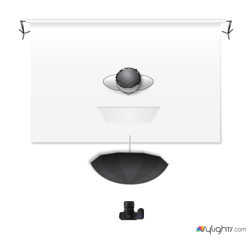 Paraguas frontal a 45° montado en un boom con un reflector inferior rellenando sombras de cuello