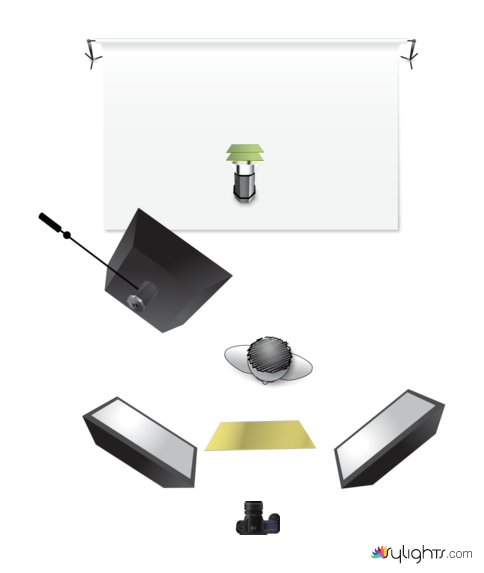 Hairlight softbox on boom, high and angled to give light on subject’s shoulders and hair (1/8th power, metering f/4)