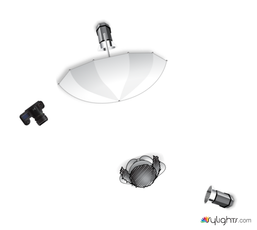 Key light using Paramount/Butterfly pattern and a fill light at the back to separate the figure from the background.