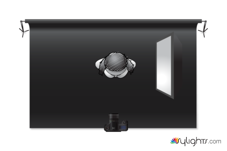 A single light source is used as the key light, placed at a low angle to the subject to create deep shadows and contrast.