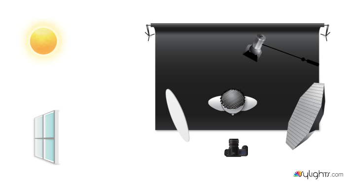 sonnenlicht aus Fenster nutzen und mit Diffosor weicher machen. Mit Softbox aufhellen und Unaufälliges Spitzlich. Alles vor schwarzer Leinwand.