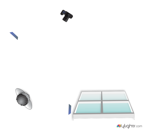 Both lights are LED lights with a blue gel. The one at the window will be fixe on the curtain stick. In this way it will not appears on the mirror. The intensity of the light of the window is higher.