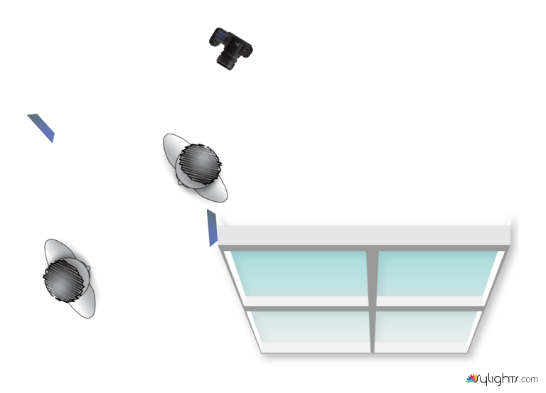 Both lights are LED lights with a blue gel. The one at the window will be fixe on the curtain stick. In this way it will not appears on the mirror. The intensity of the light of the window is higher.