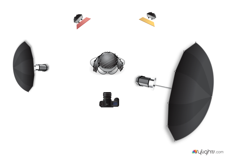 a parabolic umbrella with strobe camera right light the subject. A small reflective umbrella on camera left for a small fill. Two speed lights behind subject with colored gels to get lens flare speed lights about 1/8 0r 1/4 power. Camera at f4,shutter 1/125 iso 800?
