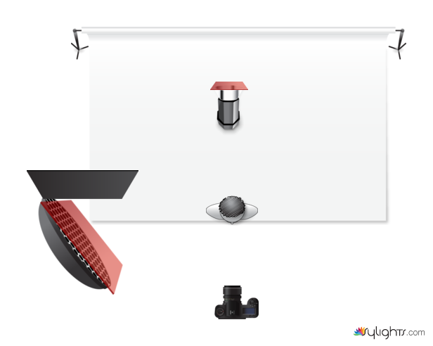 grey backdrop, v stand used as a gobo. backlight placed at the bottom of the floor. gel placed on the main light is red. gel placed on backlight is magenta