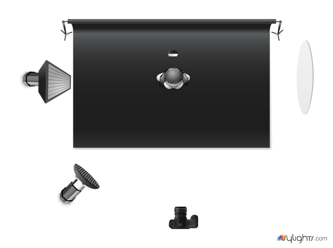 1) Luz principal lateral para que se vea el humo del sahumerio preferentemente con Strip Box.