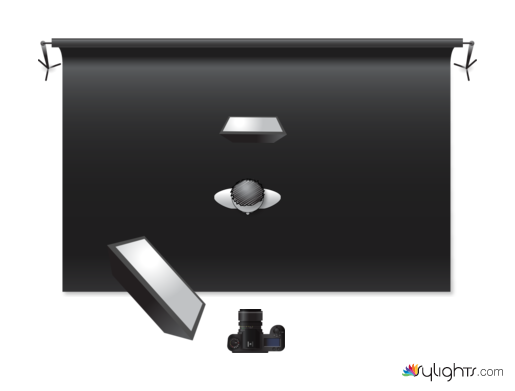 Càmera a les 6, model a les 6; llum principal a les 7, 0º; llum de fons a les 12, 0º