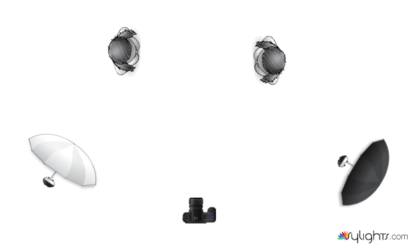 Each umbrella (white and silver) are about 1,5~2 meter from the modells, high up and tilt down and set to the same power.