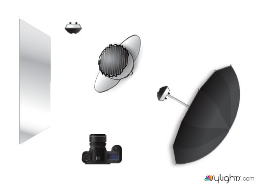 Using one strobe to bounce light on an umbrella for soft lighting. another strobe for the backlight on the white wall behind me. The light reflector is used to bounce back some light onto the shadow area of my face and right hand.