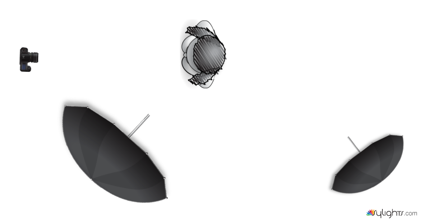 Speedlight Nr 2 : in reflected umbrella to the right as well but behind model just to brighten up the background a bit (on very low power)