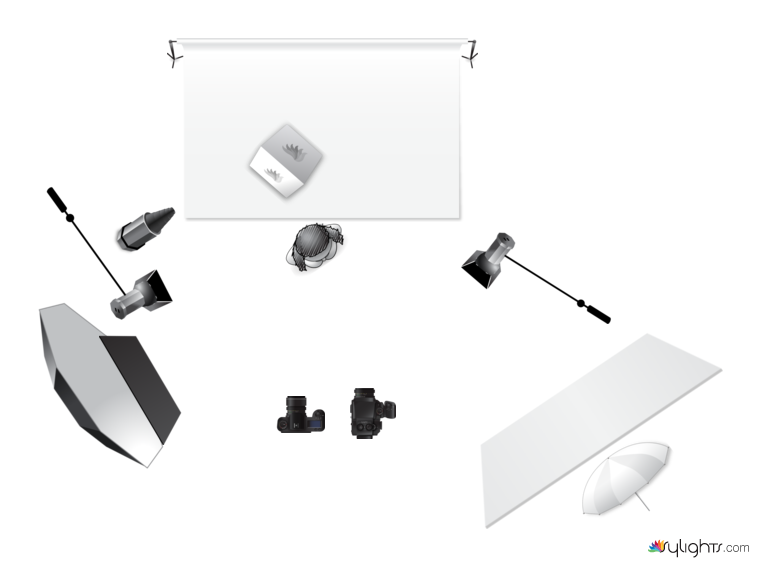 Fill Light: Shoot through umbrella behind a Westcott Scrim Jim metered at F/2.8 positioned at camera right.