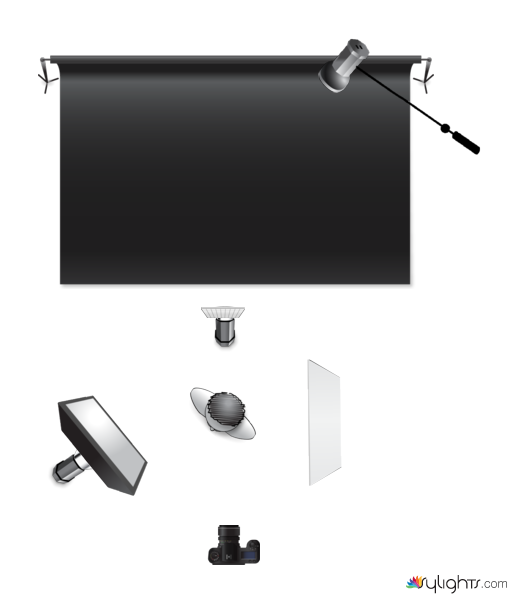 Fill light facing backdrop, some pics with red gel. Between subject and backdrop, approx 3’ between subject and fill light with fill light inbetween