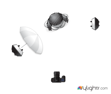 Subject to stand at 45 degrees. The subjects face is broadside to the umbrella.