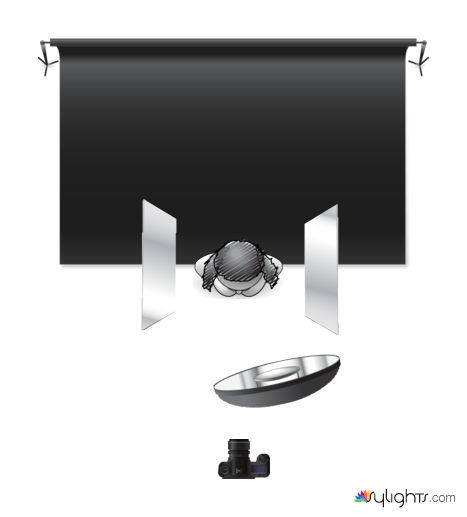 Beauty dish was tilted down and there were silver reflectors on each side.
